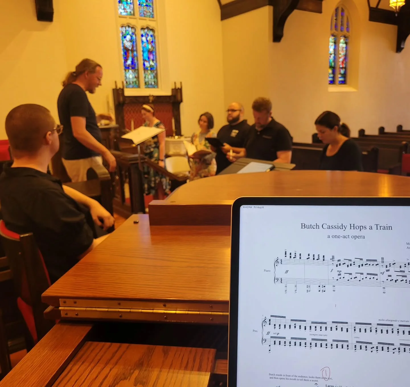 2023Butch Cassidy Hops a Train, opera in one act for 2 sopranos, mezzo, tenor, two baritones, and chorus; piano, clarinet, violin, double bass
